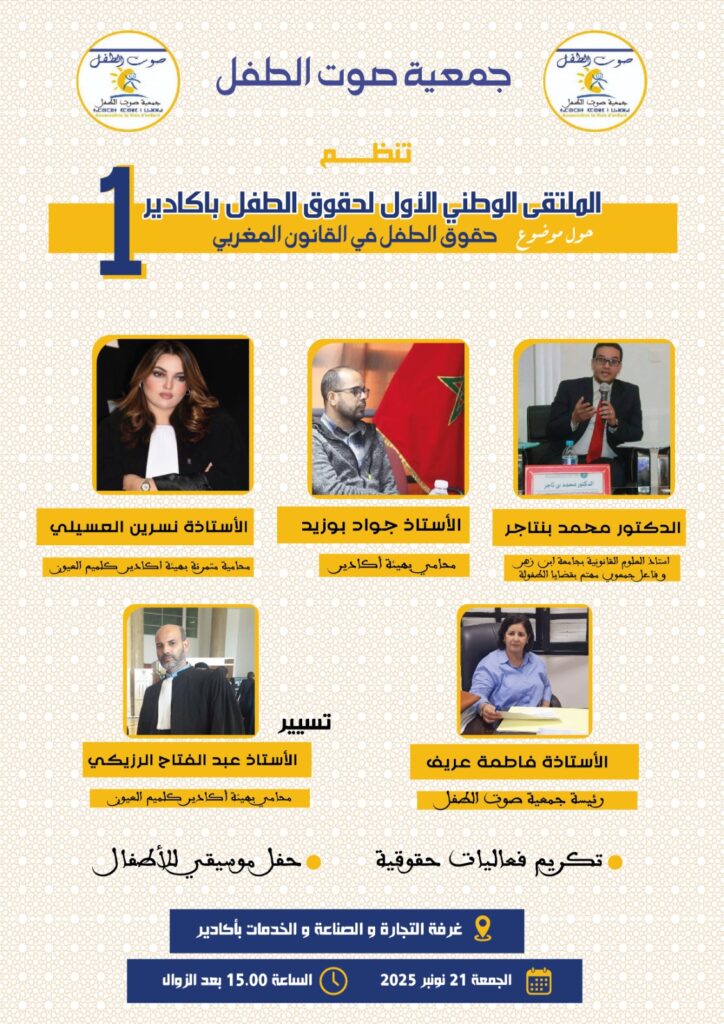 بمناسبة اليوم العالمي للطفل، وفي إطار برنامجها السنوي، تنظم جمعية صوت الطفل أكادير، يوم الجمعة 21 نونبر 2025، فعاليات الملتقى الوطني الأول لحقوق الطفل، حول موضوع: “حقوق الطفل في القانون المغربي”، بمقر غرفة التجارة والصناعة والخدمات بأكادير، ابتداء من الساعة الثالثة بعد الزوال.