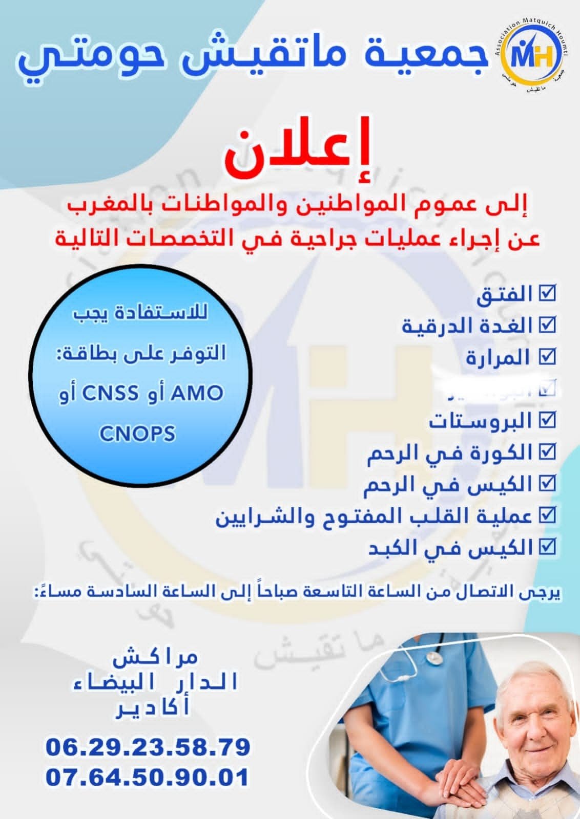 في إطار جهودها الإنسانية والاجتماعية، تُعلن جمعية متقيش حومتي عن تنظيم حملة طبية وطنية تشمل عمليات جراحية مجانية لفائدة عموم المواطنات والمواطنين المغاربة، وذلك في عدة تخصصات طبية، من بينها: