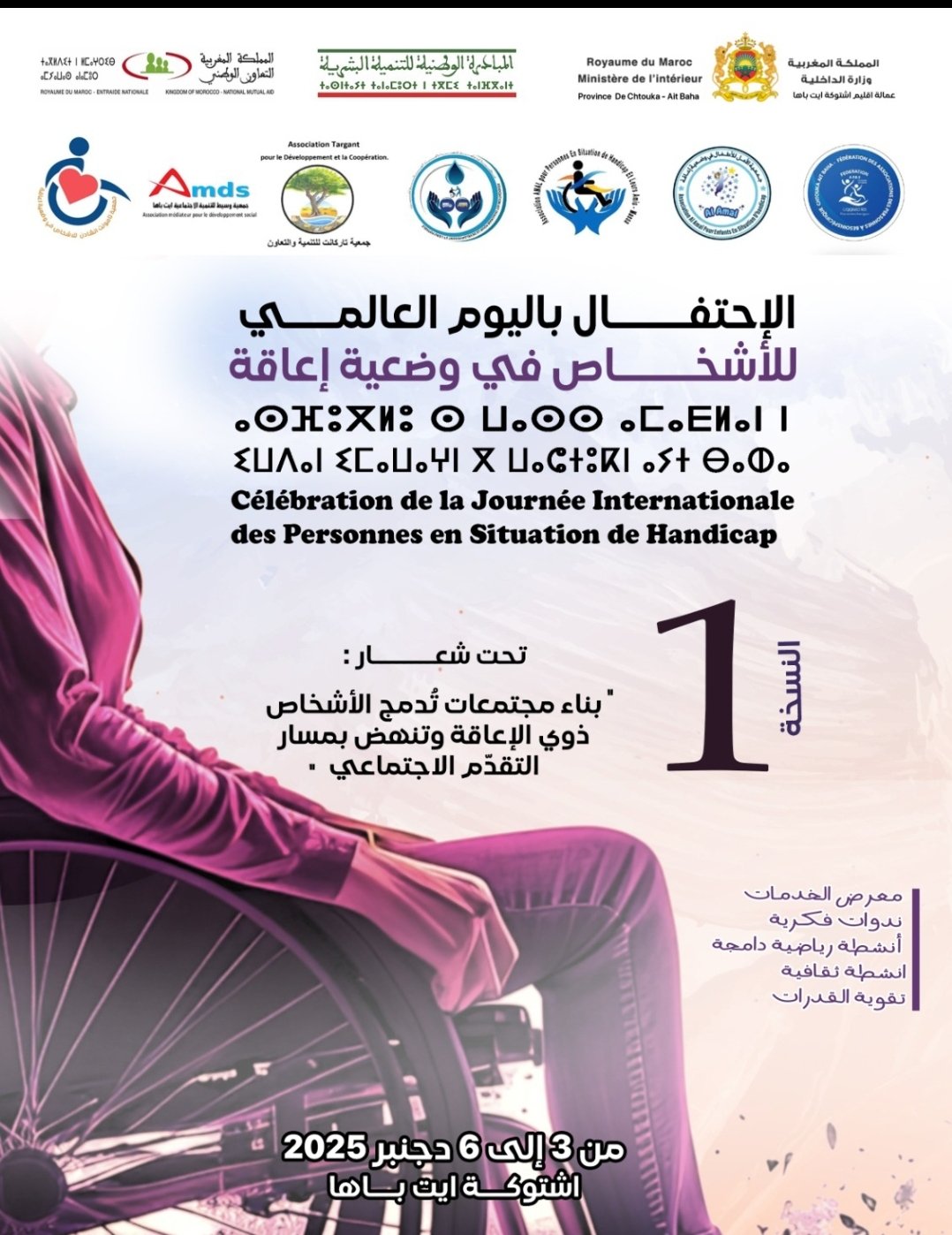 تخليداً لليوم العالمي للأشخاص في وضعية إعاقة، الذي يصادف 03 دجنبر من كل سنة، وتحت شعار: “بناء مجتمعات تُدمج الأشخاص ذوي الإعاقة وتنهض بمسار التقدّم الاجتماعي”، تنظم الجمعيات العاملة في مجال الإعاقة بالإقليم، بشراكة استراتيجية مع المبادرة الوطنية للتنمية البشرية، فعاليات الدورة الاحتفالية السنوية خلال الفترة الممتدة من 03 إلى 06 دجنبر 2025 بمدينة بيوكرى.