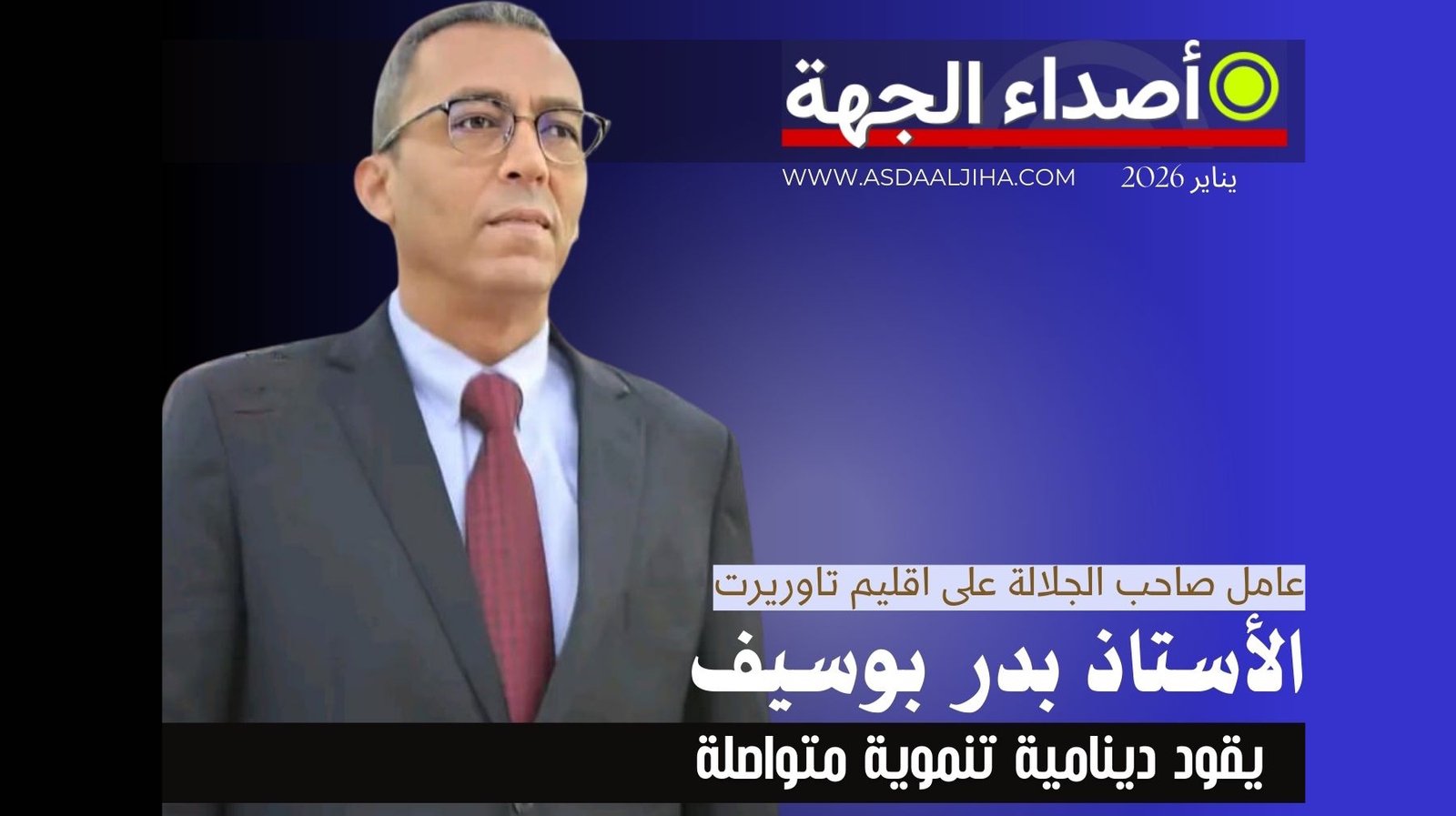 منذ تعيينه من طرف صاحب الجلالة الملك محمد السادس نصره الله وأيده عاملاً على إقليم تاوريرت، يواصل السيد بدر بوسيف القيام بمهامه في إطار تنزيل التوجيهات الملكية السامية، الرامية إلى تعزيز الحكامة الترابية، وتقريب الإدارة من المواطنين، ودعم مسار التنمية المستدامة على مستوى الإقليم.