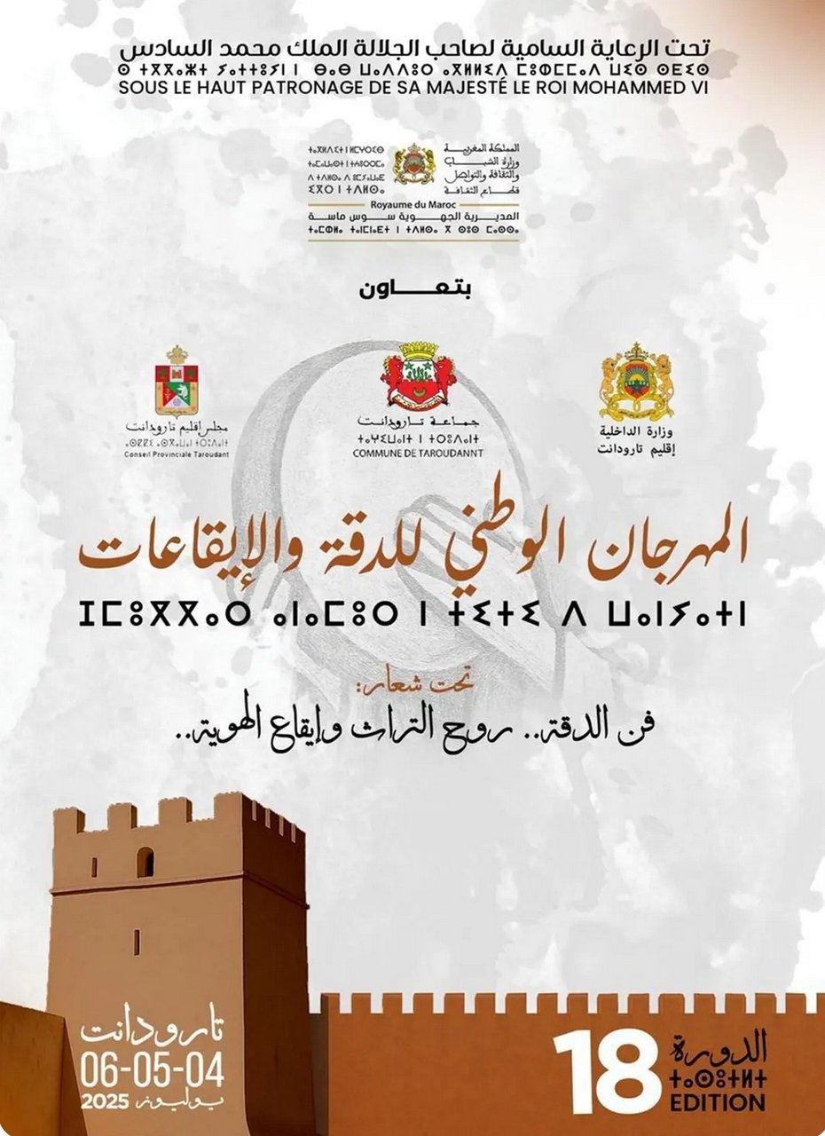 تحت الرعاية السامية لصاحب الجلالة الملك محمد السادس نصره الله، تنظم وزارة الشباب والثقافة والتواصل – قطاع الثقافة، بتعاون مع عمالة إقليم تارودانت والمجلسين الإقليمي والجماعي لتارودانت ما بين 4 و6 يوليوز2025، فعاليات الدورة 18 للمهرجان الوطني للدقة والايقاعات، بساحة 20 غشت بمدينة تارودانت، تحت شعار “فن الدقة روح التراث وايقاع الهوية “