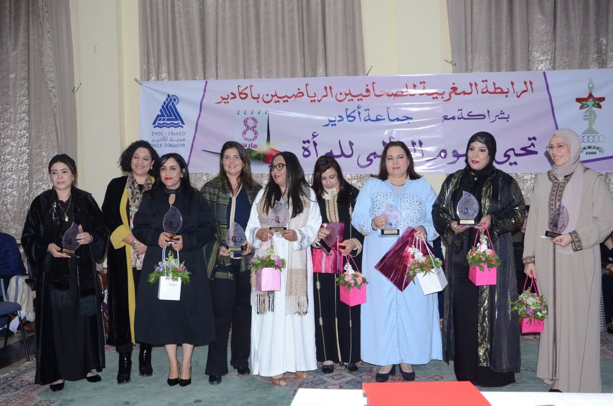 اليوم في حفل تكريم مجموعة من النساء بمناسبة اليوم العالمي للمرأة الذي نظمته الرابطة المغربية للصحافيين الرياضيين بشراكة مع جماعة أكادير وذلك بغرفة التجارة والصناعة والخدمات . وقد كان حفلا تكريميا لنساء رائدات فاعلات في مجالات عدة، نظير ما يقدمن من عطاءات وابداعات متميزة.
