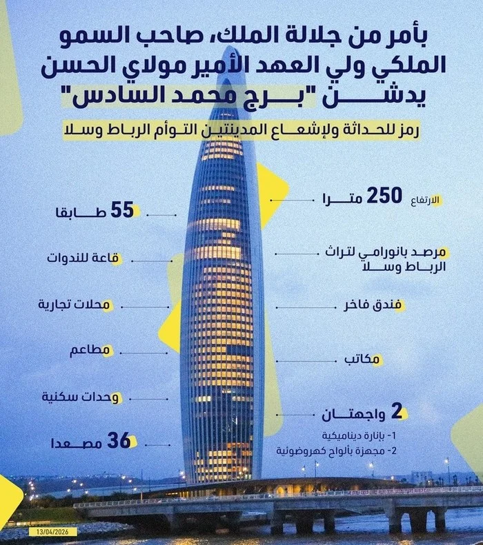 في خطوة تعكس الدينامية التنموية المتواصلة التي يشهدها المغرب تحت القيادة الرشيدة لصاحب الجلالة الملك محمد السادس، أشرف ولي العهد صاحب السمو الملكي الأمير مولاي الحسن، بأمر من جلالته، على تدشين “برج محمد السادس” بالضفة اليمنى لوادي أبي رقراق، في حدث وطني بارز يجسد الطموح المغربي نحو ترسيخ مكانته ضمن الدول الصاعدة.