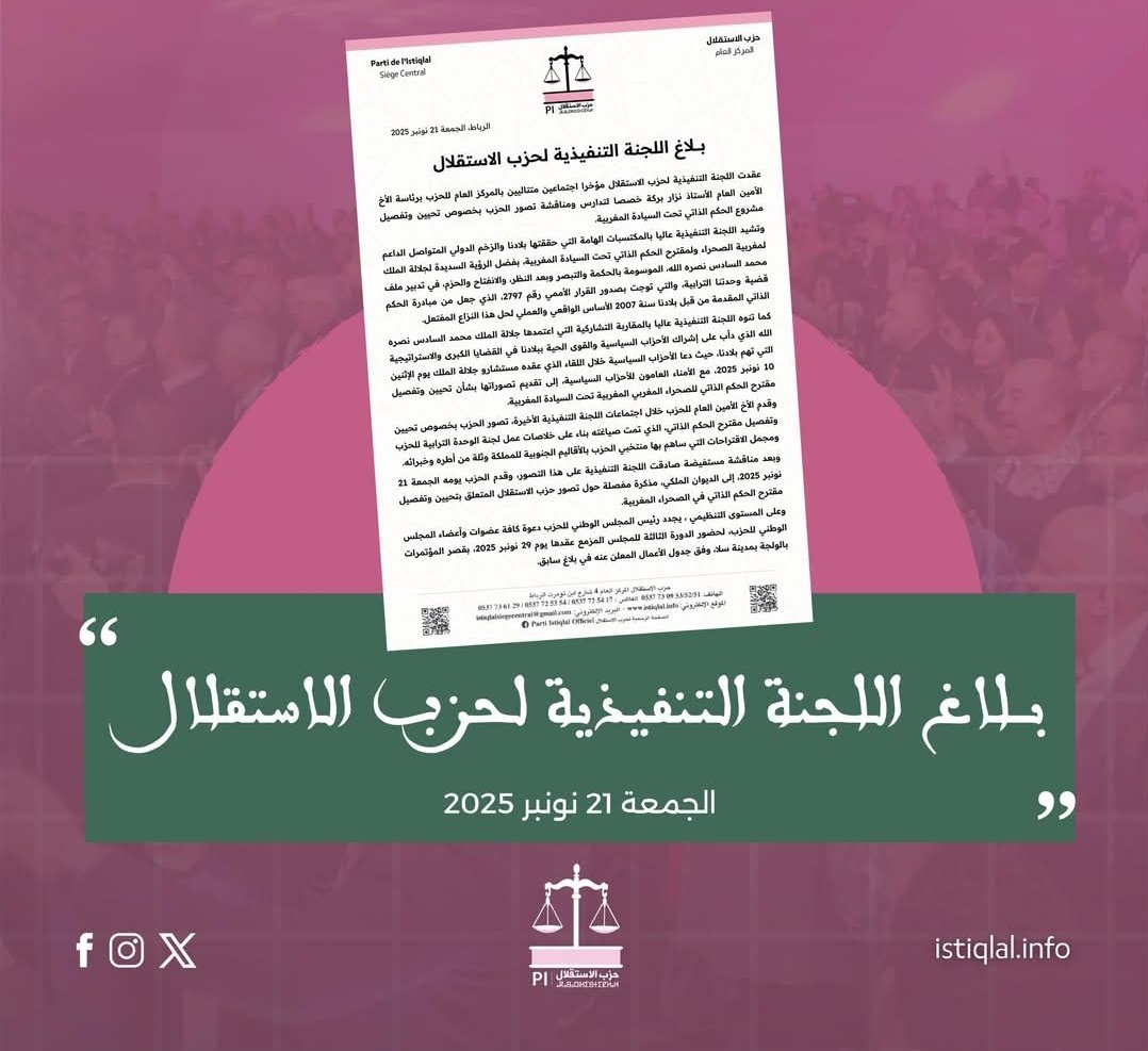 وبعد مناقشة مستفيضة صادقت اللجنة التنفيذية على هذا التصور، قدم الحزب يومه الجمعة 21 نونبر 2025، إلى الديوان الملكي، مذكرة مفصلة حول تصور حزب الاستقلال المتعلق بتحيين وتفصيل مقترح الحكم الذاتي في الصحراء المغربية.