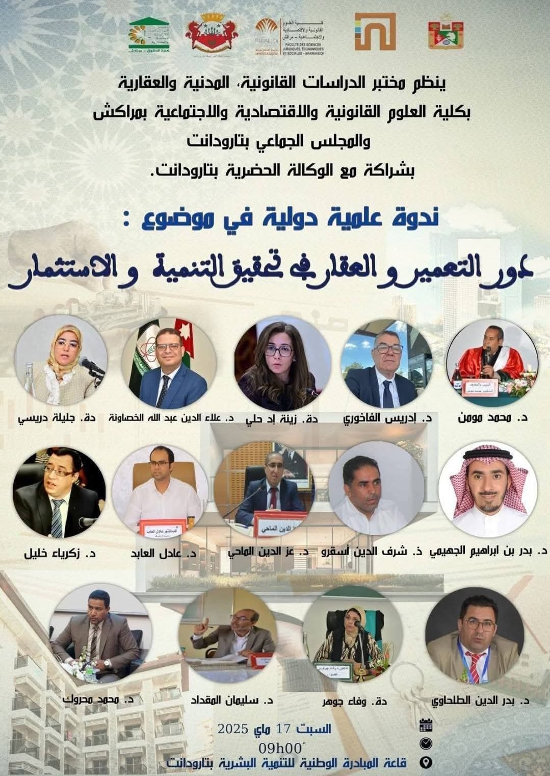 تنظم كلية العلوم القانونية والاقتصادية والاجتماعية بمراكش، من خلال مختبر الدراسات القانونية المدنية والعقارية، بشراكة مع المجلس الجماعي لتارودانت والوكالة الحضرية للمدينة، ندوة علمية دولية تحت عنوان: “دور التعمير والعقار في تحقيق التنمية والاستثمار”، وذلك يوم السبت 17 ماي 2025، ابتداء من الساعة التاسعة صباحاً، بقاعة المبادرة الوطنية للتنمية البشرية بتارودانت.